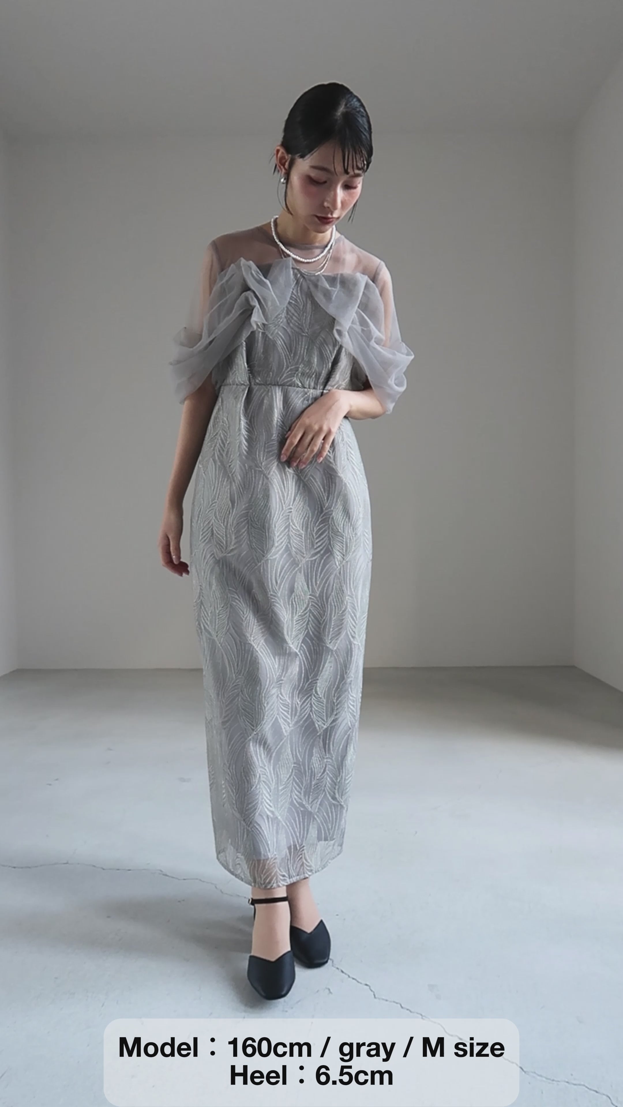 繊細なチュールとリーフ刺繍が重なり、着るだけで上品な雰囲気を演出するロングドレス。