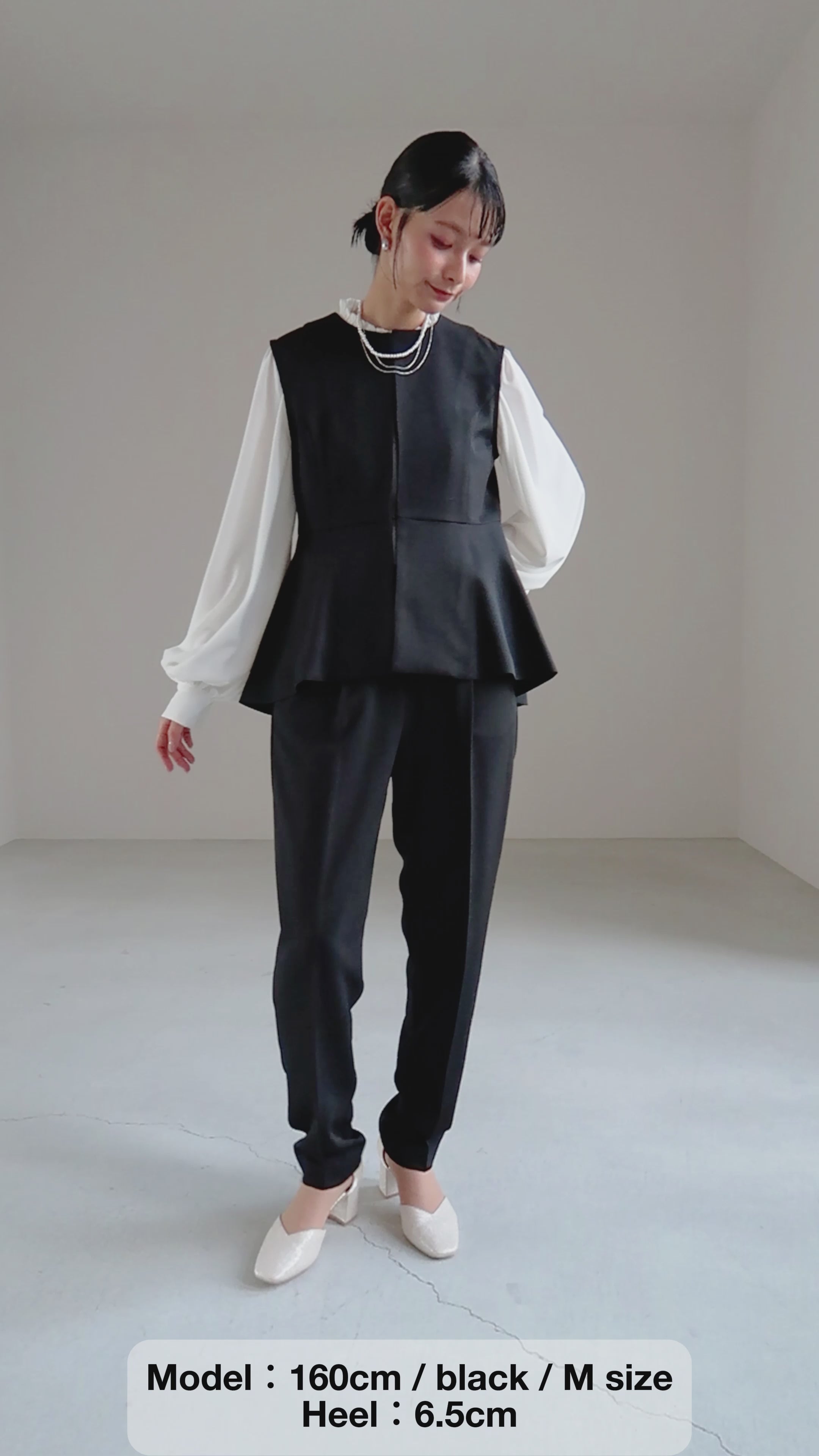 丸首ベストとふんわり袖のブラウスで柔らかな印象を演出しつつ、ストレートパンツが全体をすっきりとまとめます。