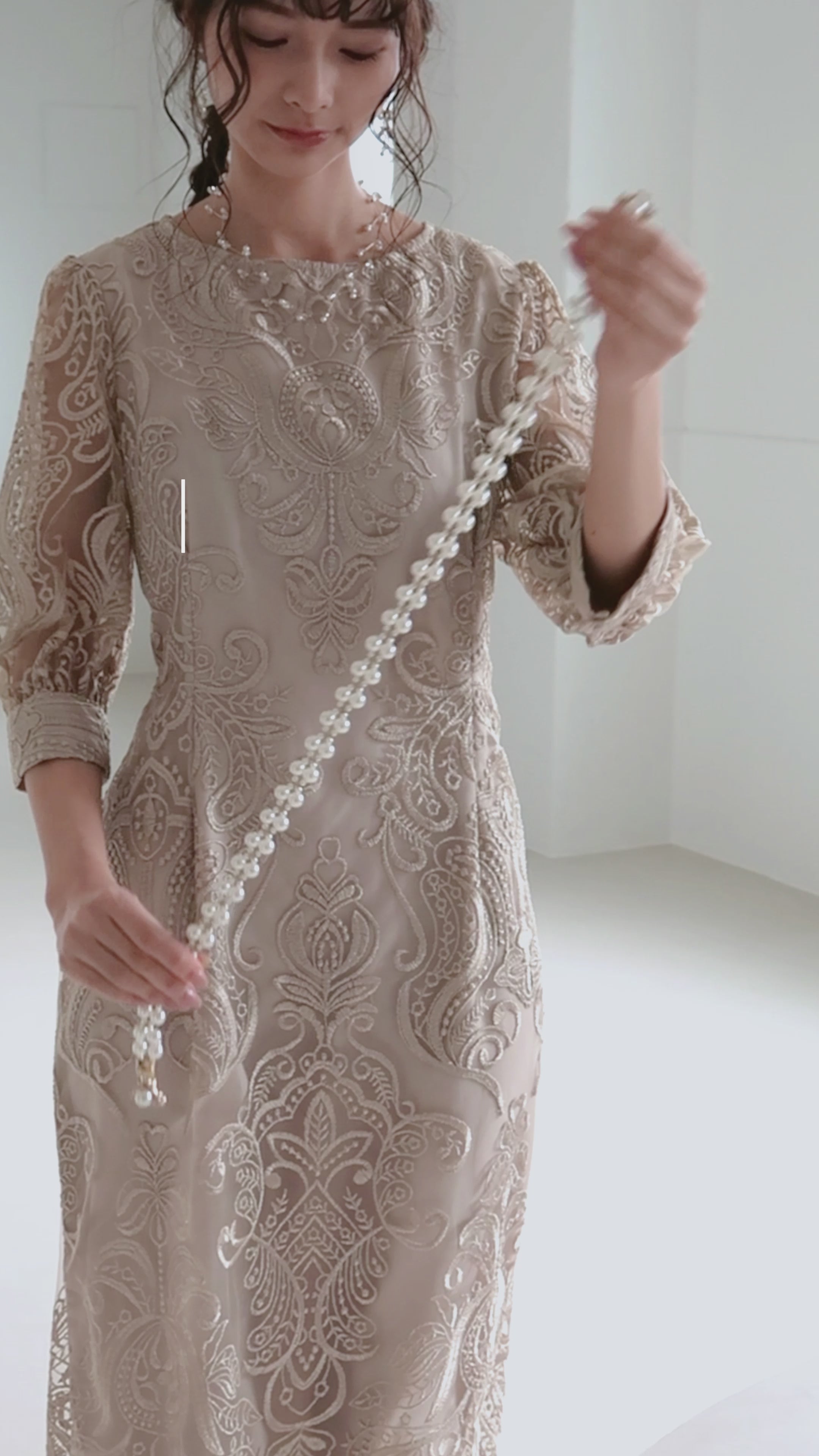 シンプルでありながらも、ウエストにパール装うことで、華やかなニュアンスを加えてくれます。